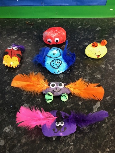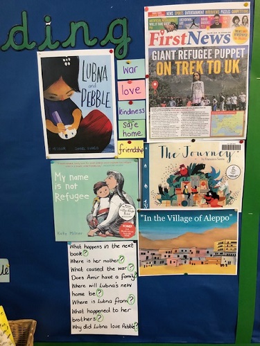 We've been busy creating pebbles and exploring the refugee theme of our whole school book week, using 'Lubna and Pebble' as our main story. As you can see, we've also been looking at other texts. We thought carefully about words which we felt were important in our theme. Can you spot them?