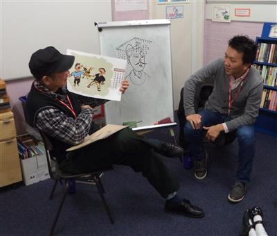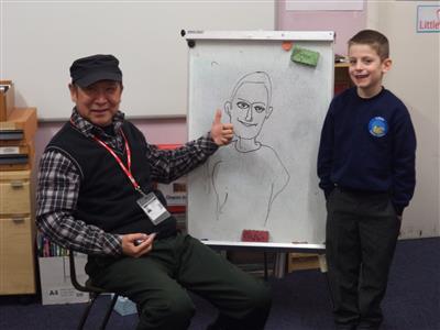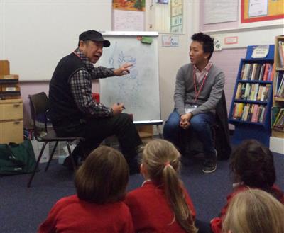On Wednesday 14th November Year 2 were visited by Chinese comic book artist Li Kunwu and his son Lufei. Li Kunwu is from Yunnan province in southwest China and has published comic books telling stories about his home province, the most famous of which is his A Chinese Life. Li Kunwu was in England to visit his son Lufei (Mr Wood's friend) and kindly gave up some of his time to visit our school. The Year 2 classes took it in turns to ask Li Kunwu questions about his life and his artwork and got to see some of his paintings and also watch him draw. The children asked some very thoughtful questions which Li Kunwu enjoyed answering (and which kept Mr Wood on his toes translating!) Some examples included the following: "What inspired you to be an artist?", "What was the first thing you every drew?", "What's your favourite thing to draw?", "Do you draw famous people, like the Queen?" and "Do you ever draw chocolate bars?" ("No, because every time I try they just seem to disappear!") Although Li Kunwu has visited many secondary schools and universities to talk about his work, especially in France where a lot of his work is published in translation, this was his first time to visit a primary school and it was an experience he really enjoyed. Some lucky pupils also got to see themselves in cartoon form! The children got to hear Mr Wood speak Chinese (although luckily Lufei was able to translate the trickier parts!) and it was also an opportunity for our Chinese-speaking students to impress their classmates with their language skills. Thanks to their hard work in Chinese Friday club with Miss Li, all of our pupils impressed Li Kunwu with their ability to greet him was a cheery ni hao (hello), show their appreciation by saying xie xie (thank you) and bid him farewell with zai jian (goodbye). Thank you very much to Li Kunwu for giving up his time for free and providing such a memorable experience for our children and to Lufei for helping with the organisation and translation.
